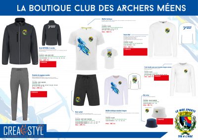 Présentation des différents articles proposés par le club : Tee shirt ; Bermuda ; Sweat shirt ; Softshell ; Bob ; mini serviette ; Pantalon